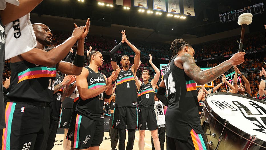 SAN ANTONIO, TX - APRIL 19: The San Antonio Spurs celebrate after the game against the Portland Trail Blazers during Round One Game One of the 2026 NBA Playoffs on April 19, 2026 at the Frost Bank Center in San Antonio, Texas. NOTE TO USER: User expr