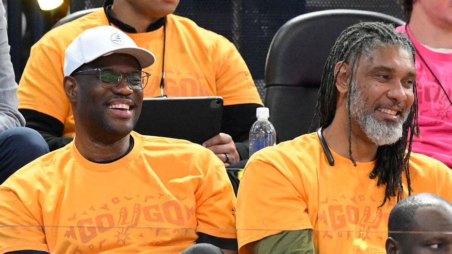 SAN ANTONIO, TX - APRIL 19: Tim Duncan and David Robinson attend a game between the San Antonio Spurs and the Portland Trail Blazers during Round One Game One of the 2026 NBA Playoffs on April 19, 2026 at the Frost Bank Center in San Antonio, Texas.