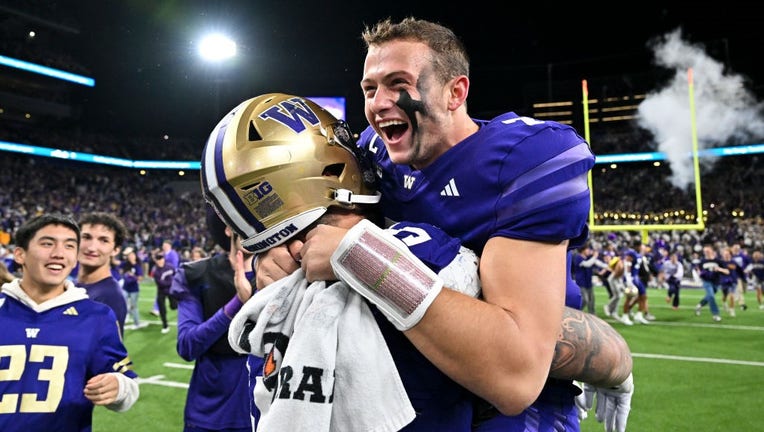 SEATTLE, WASHINGTON - OCTOBER 05: Will Rogers #7 of the Washington Huskies celebrates after the game against the Michigan Wolverines at Husky Stadium on October 05, 2024 in Seattle, Washington. The Washington Huskies won 27-17. (Alika Jenner / Getty Images)