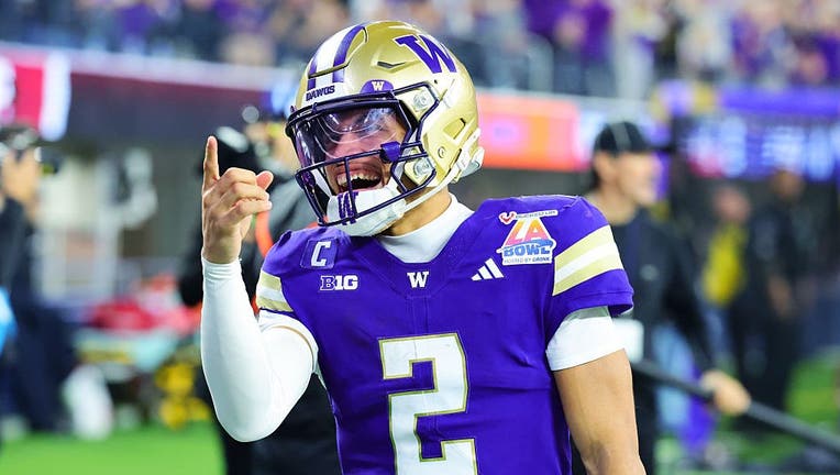 INGLEWOOD, CALIFORNIA - DECEMBER 13: Quarterback Demond Williams Jr. #2 of the Washington Huskies points up at the fans after throwing a scoring pass during the first half of the LA Bowl Game against the Boise State Broncos at Sofi Stadium on Decembe (Kevin Terrell / Getty Images)
