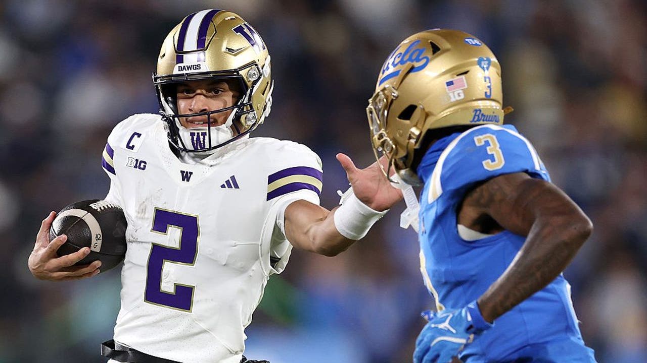 PASADENA, CALIFORNIA - NOVEMBER 22: Demond Williams Jr. #2 of the Washington Huskies stiff arms Robert Stafford III #3 of the UCLA Bruins during the second quarter at Rose Bowl Stadium on November 22, 2025 in Pasadena, California. (Luke Hales / Getty Images)
