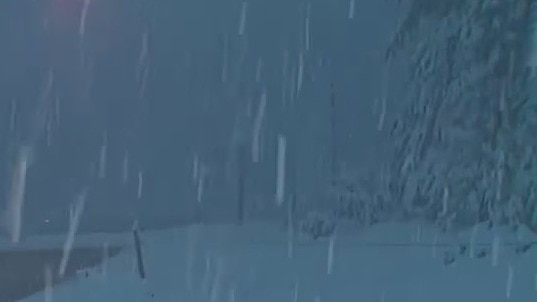 Snow is sticking on the ground, making it a slippery drive over Snoqualmie Pass.