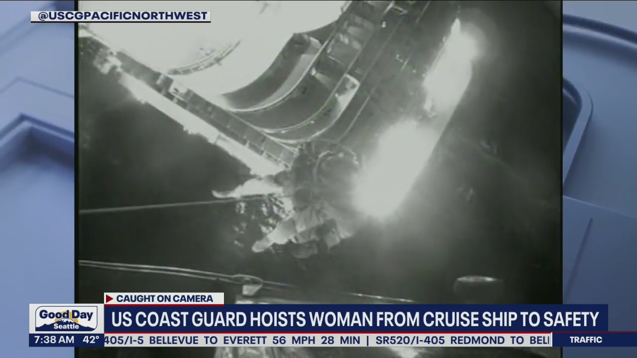 US Coast Guard from Port Angeles hoists a woman who suffered a heart attack on a cruise ship to safety.
