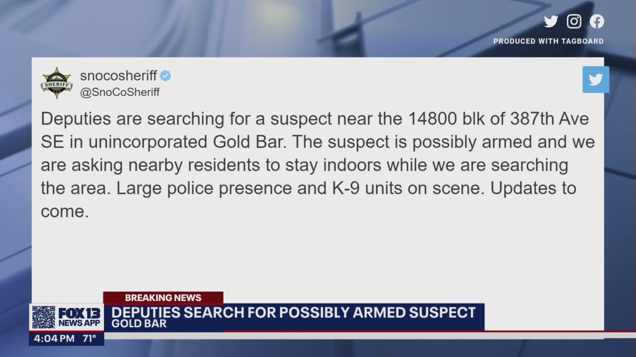 Snohomish County Sheriff's deputies are looking for a suspect in Gold Bar. He is a 56-year-old man who is 5'10" with blonde-gray hair.