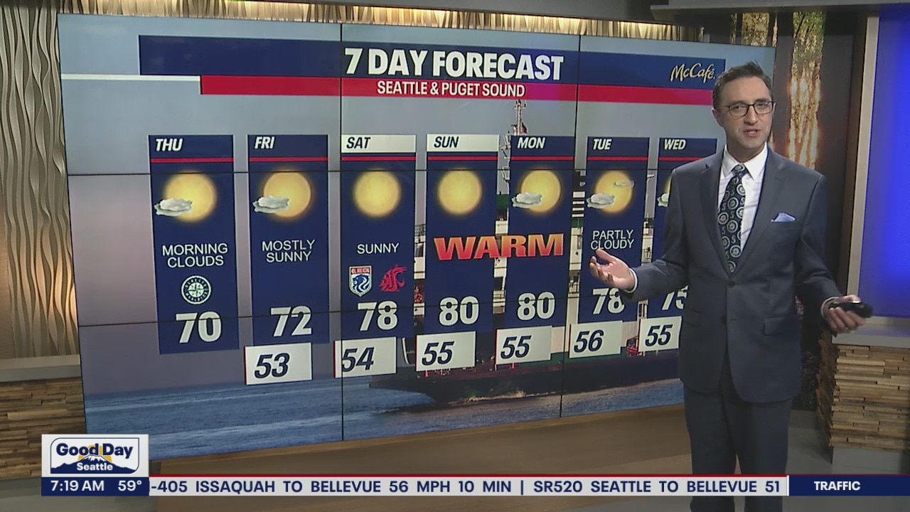The Seattle, Puget Sound region will see temperatures in the 70s for the tail end of the week. This weekend, temperatures will likely be nearing the 80s, which could potentially break some records. Rain does not appear to be in the forecast for the next several days.