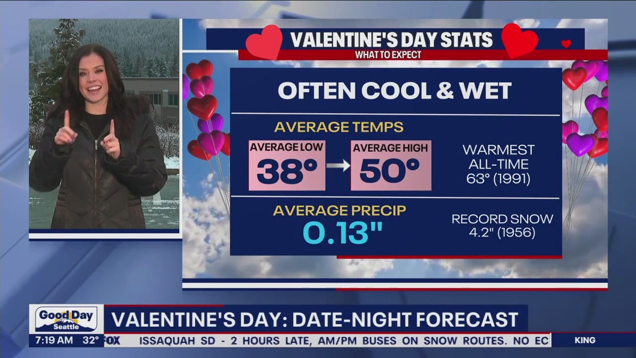 FOX 13 Meteorologist Abby Acone is live from Snoqualmie Ridge offering a closer look into the Valentine's Day weather forecast, as well as some weather statistics from previous years.