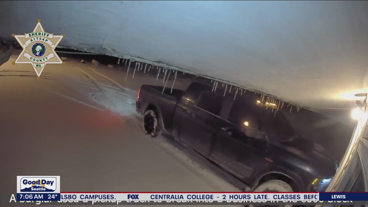 Caught on camera, a burglar uses a pick-up truck to smash into a building in Kitsap County.