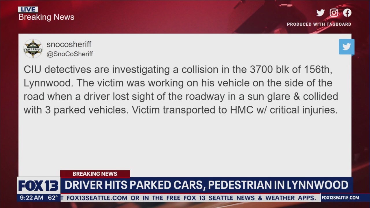 One person is in the hospital with critical injuries after a car slammed into three parked cars in Lynnwood.