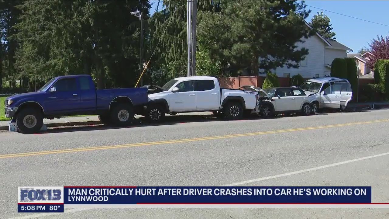 A driver crashed into parked vehicles in Lynnwood, which critically injured a man working on his vehicle.