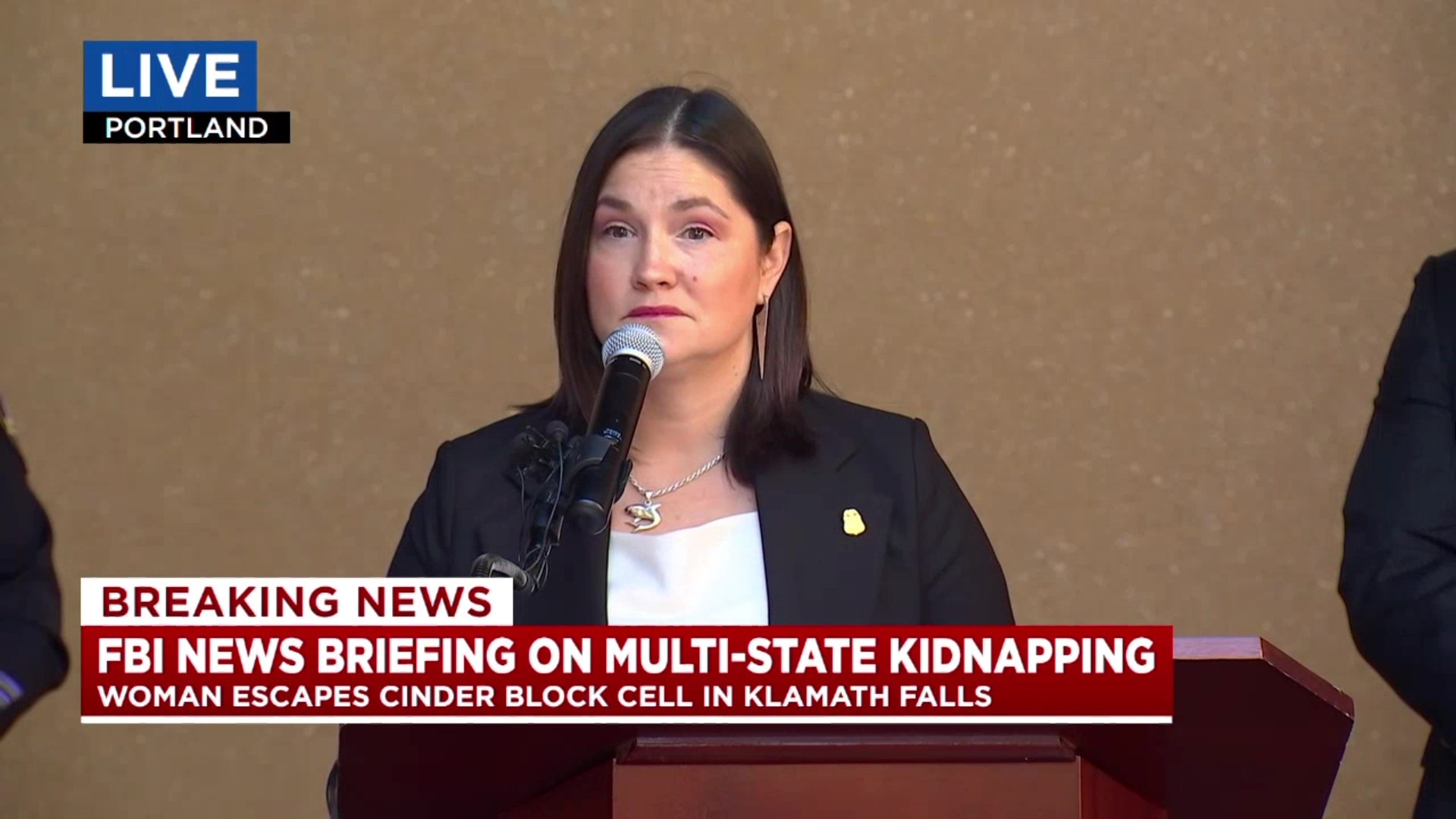 FULL NEWS CONFERENCE: A man who posed as an undercover police officer kidnapped a woman in Seattle, drove her hundreds of miles to his home in Oregon, and kept her locked in a makeshift, cinderblock jail cell until she bloodied her hands while breaking open the door to escape, the FBI said Wednesday.