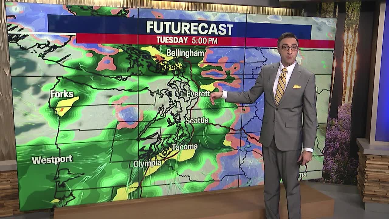 Monday, we see mostly cloudy skies and slight chance of rain, mainly north of Seattle up to Everett. We start to see our next round of active weather Tuesday and Wednesday.