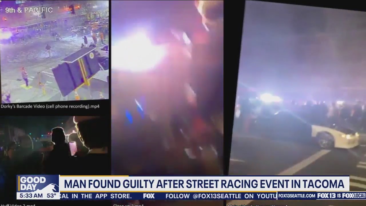 A 20-year-old man was found guilty on multiple charges in connection with a street racing event in Tacoma, Washington.