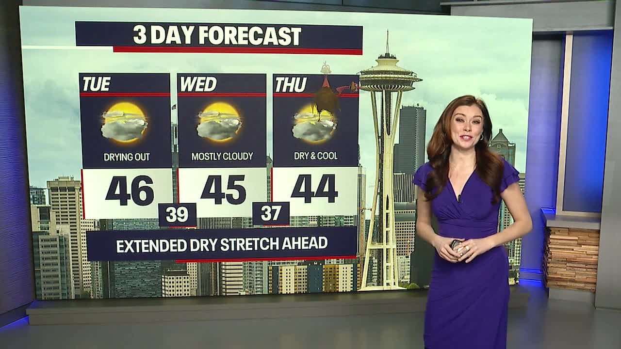 Skies will dry out through the afternoon Tuesday with highs in the mid to upper 40s, below seasonal average.