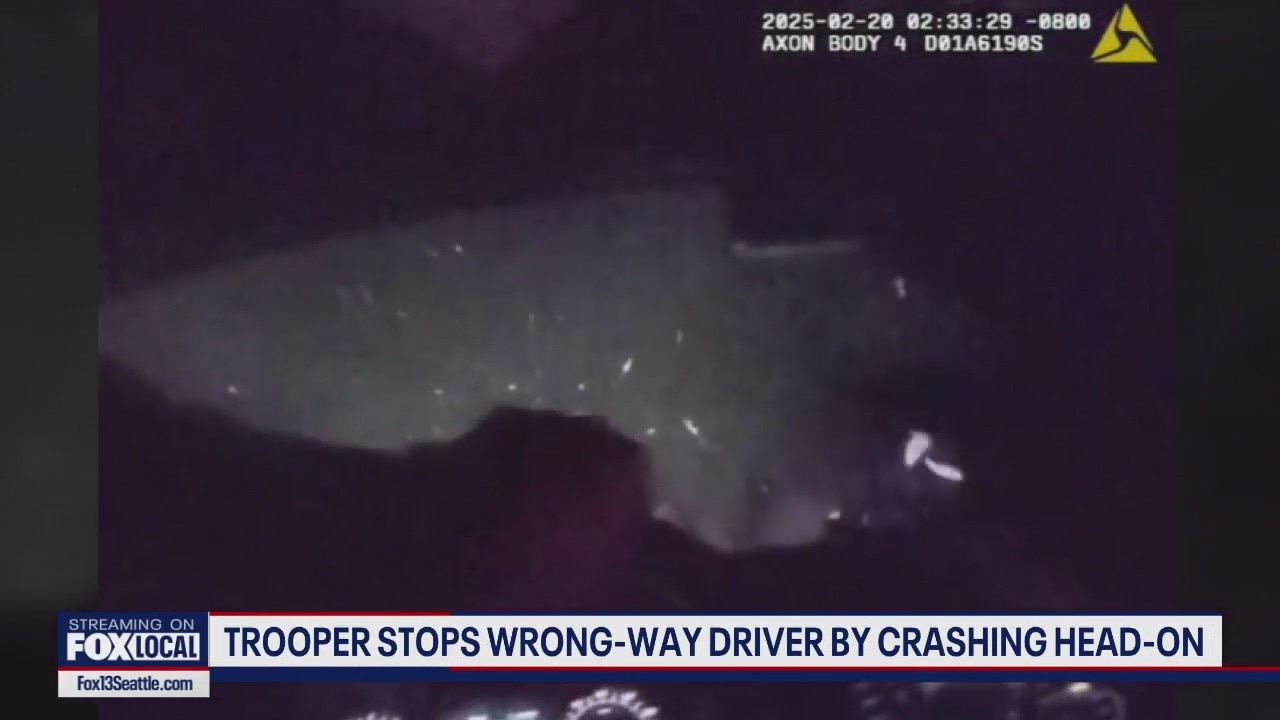 Video shows a Washington State trooper crashing head-on with a wrong-way driver to try and stop him.