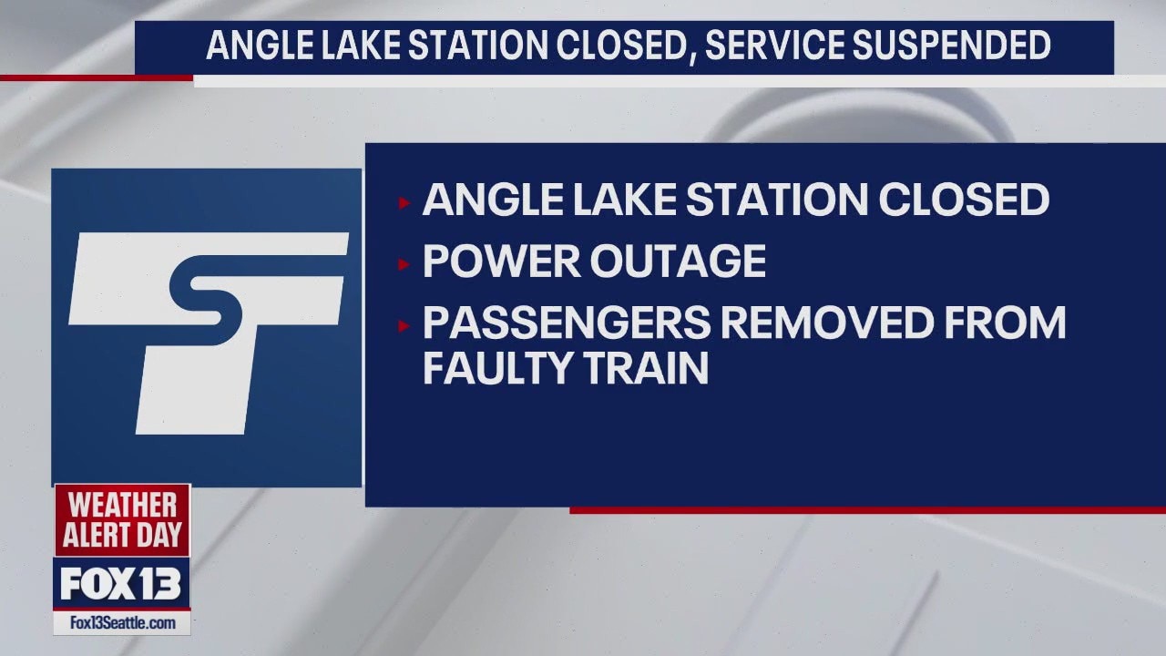 Light rail services at the Sound Transit Angle Lake station are closed until further notice due to a power outage. The Line 1 service is also suspended. Crews reportedly removed passengers from a light rail train after it got stuck on the elevated track.