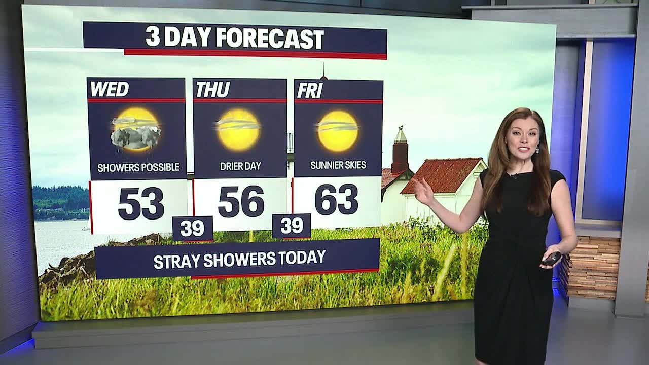 Temperatures Wednesday will be in the low to mid 50s, and we'll see showers off and on throughout the day. Most of the showers will remain in the convergence zone. But you will most likely have a wet morning commute.