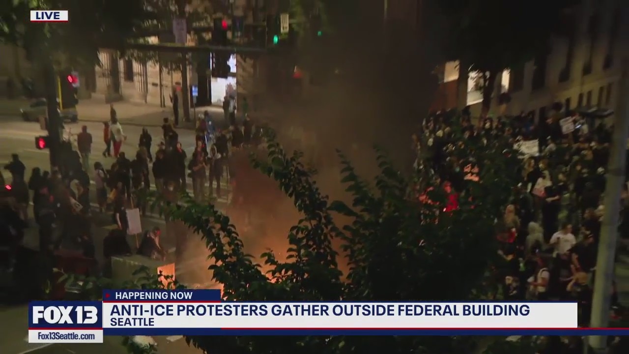 A large group of anti-ICE protesters marched through downtown Seattle and crowded the Seattle Federal Building Wednesday evening, with a large fire breaking out into the night.