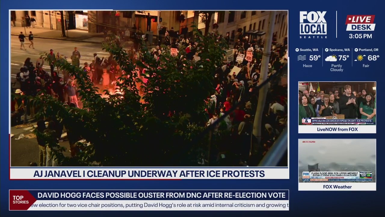 Cleanup is underway after overnight ICE protests left a trail of vandalism and dumpster fires in downtown Seattle.