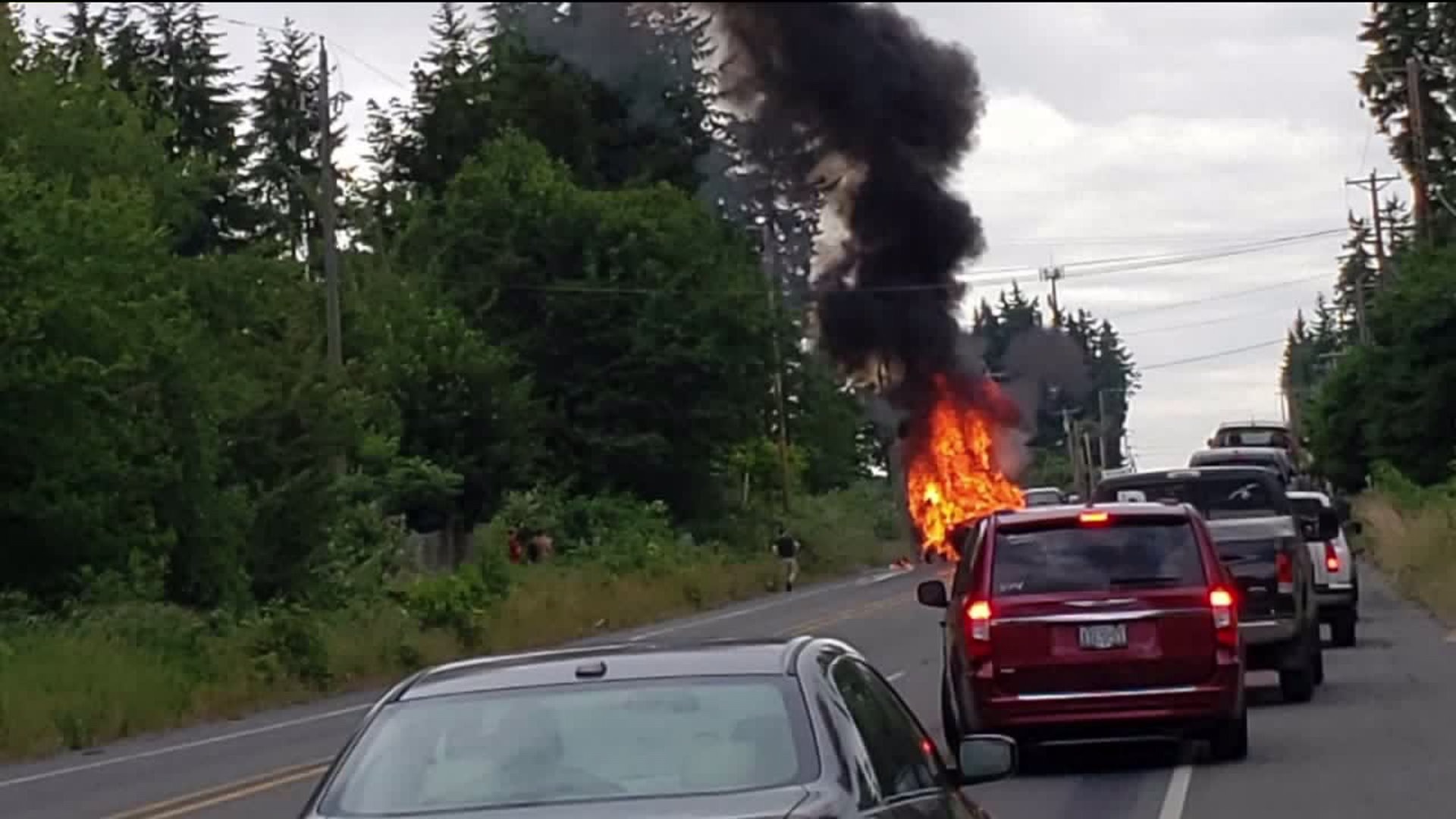 Authorities say a southbound car crossed into the northbound lanes and slammed into a semi-truck. Moments after the crash, the car caught on fire.