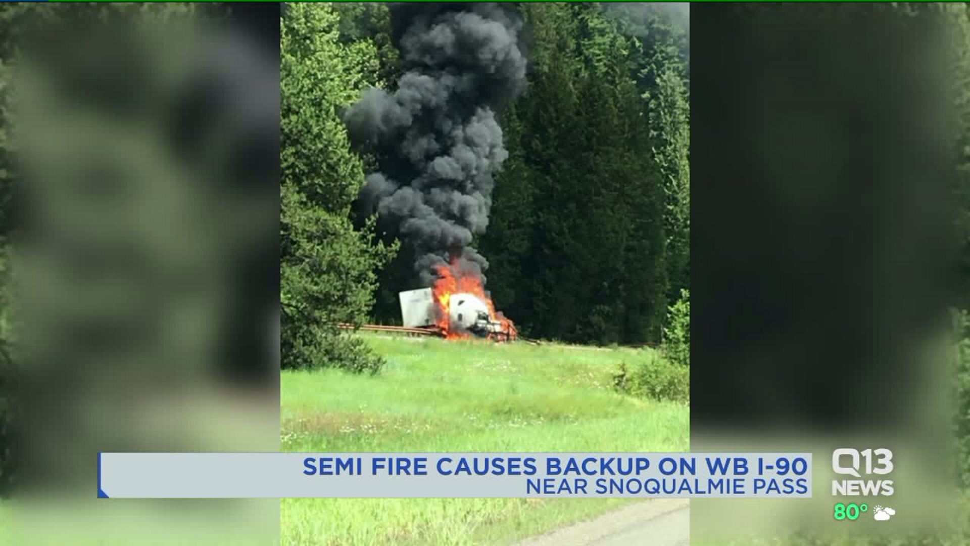 Truck driver rushed to hospital after semi crashes catches fire on I-90