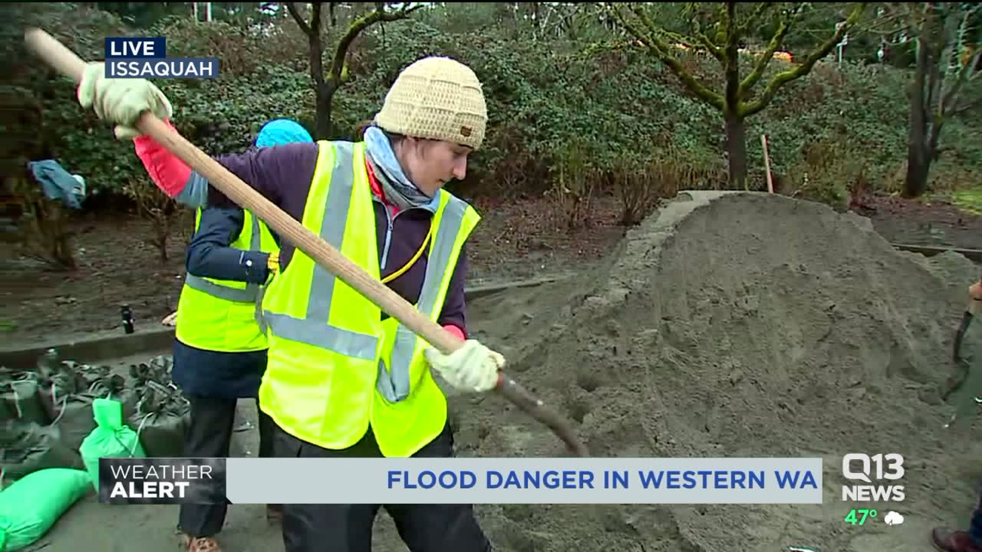 Volunteers filling sandbags in Issaquah