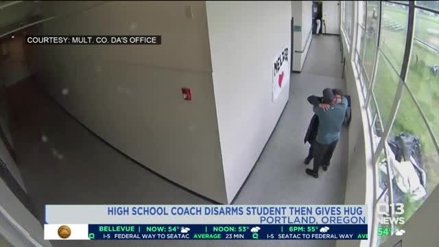 Surveillance video obtained first by KOIN 6 News shows the dramatic moment when Parkrose High School football coach Keanon Lowe disarmed a student carrying a loaded shotgun on campus. Angel Granados-Diaz was 18 when he brought the gun to school on May 17. The video obtained Friday from the Multnomah County District Attorneys Office through a public records request is the visual accompaniment to the story recounted by Lowe during a press conference earlier this year. Lowe, who also works as a security guard at Parkrose, said he had been called to the fine arts building on campus to get a student. The surveillance video showed Granados-Diaz nearly cross paths with him in a hallway.