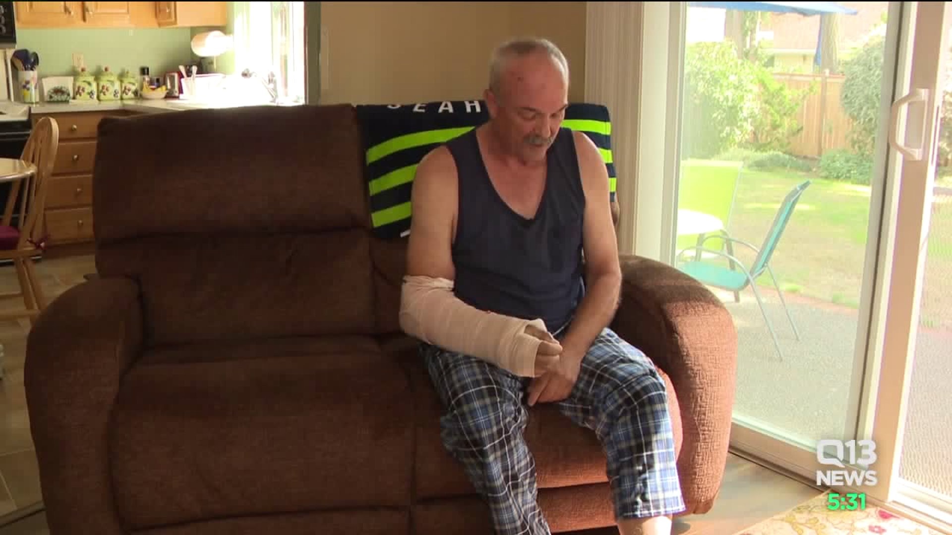 A Pierce County man is recovering after he says he was the victim of a hit-and-run driver who also dragged him halfway down an East Tacoma street. The victim was working a part-time job when it all happened last weekend. Im really blessed that I didnt get run over that bad, said victim Jim Brassfield. Brassfields arm is bandaged and his left foot is also swollen, all from what he says happened while at work. Ive got a broken wrist in two places, multiple contusions all over my body, he said. Real sore other than that.