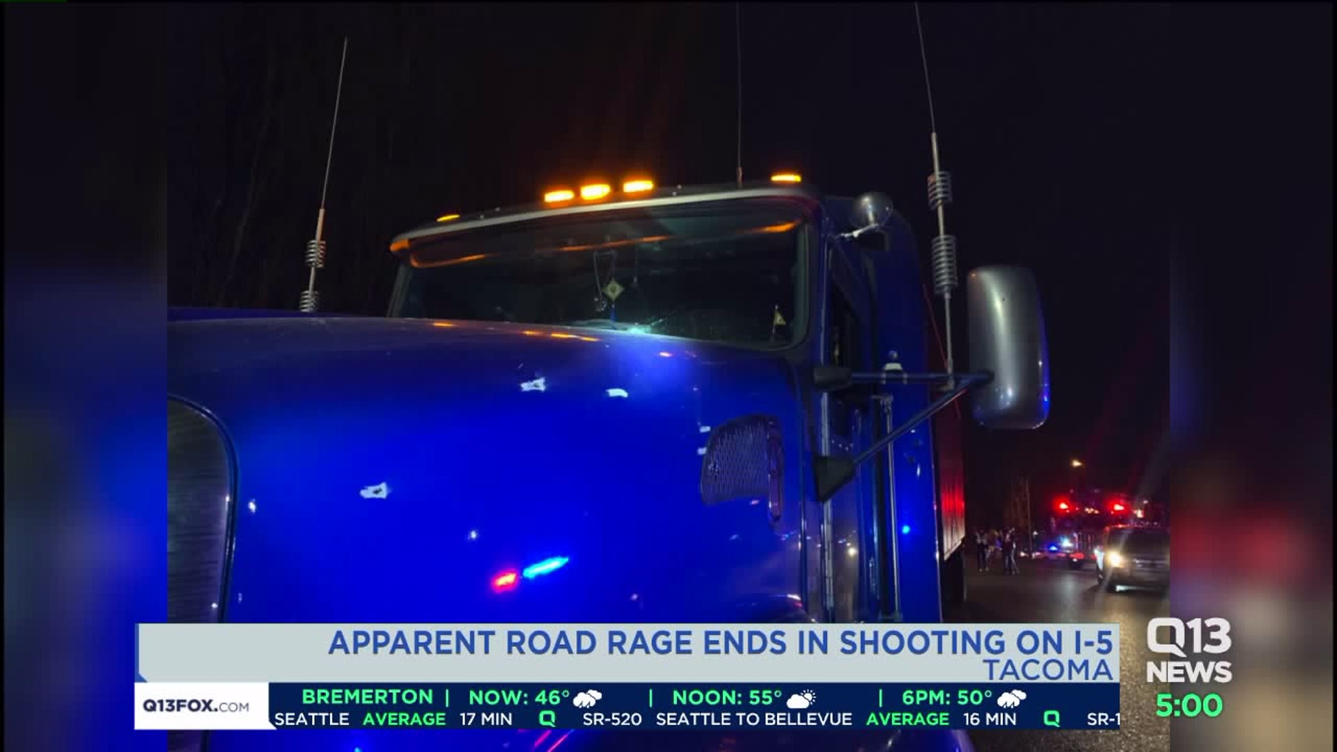 Rush-hour traffic on I-5 in Tacoma Thursday evening was compounded by a road rage shooting. According to Washington State Patrol, a semi rear-ended a car as both vehicles were traveling south on I-5 near the Port of Tacoma. Immediately after the crash, the driver got out of the car and started firing a gun at the semi. The man fired 15 shots at the semi, many of them striking the big rig. Amazingly, no one was hurt. The driver stayed on scene and was taken into custody.