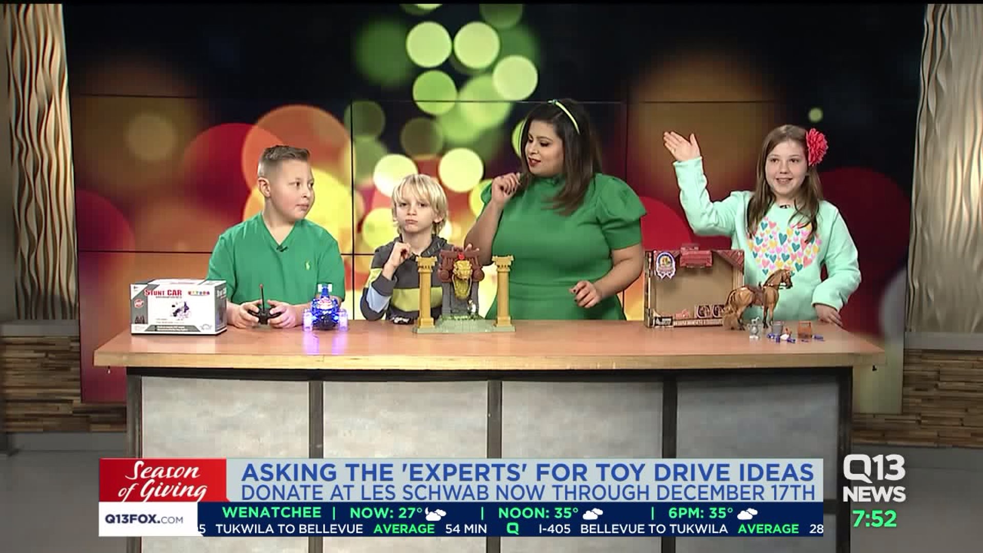 Q13 FOX's "Season of Giving" is officially underway. We've partnered again with Les Schwab Tire Centers to make sure every child gets a special toy during the holidays. In the past, you've helped donate tens of thousands of toys for kids in need here in western Washington. Here's how you can #HelpSanta this year. Donate a new and unwrapped toy to any Les Schwab Tire Center location now through December 17th. Not sure what a child would like? Our "experts" have some suggestions, including a Unicorn Styling Head, this remote control car, and a pogo hopper that's compact and can be used both indoors and out. If you can't make it out to the store, we've added a way for you to donate online. See the entire Toy Drive Wishlist here, pick the items you'd like to donate and we'll make sure Santa's elves get the toys into the hands of kids in need. Toys collected go to kids within the communities they're donated. For example, if you drop off a new, unused toy to a Les Schwab Tire Center in Poulsbo, a child in Kitsap County will directly benefit from your kindness. Benefiting charities of this year's Toy Drive include the Forgotten Children's Fund, the Christmas House, Toys for Tots, Toys for Kids, Christmas for Kids, Skagit County Christmas Fund, Kitsap Community Resources - Christmas Angel, The Salvation Army and Whidbey's Hope for Christmas.