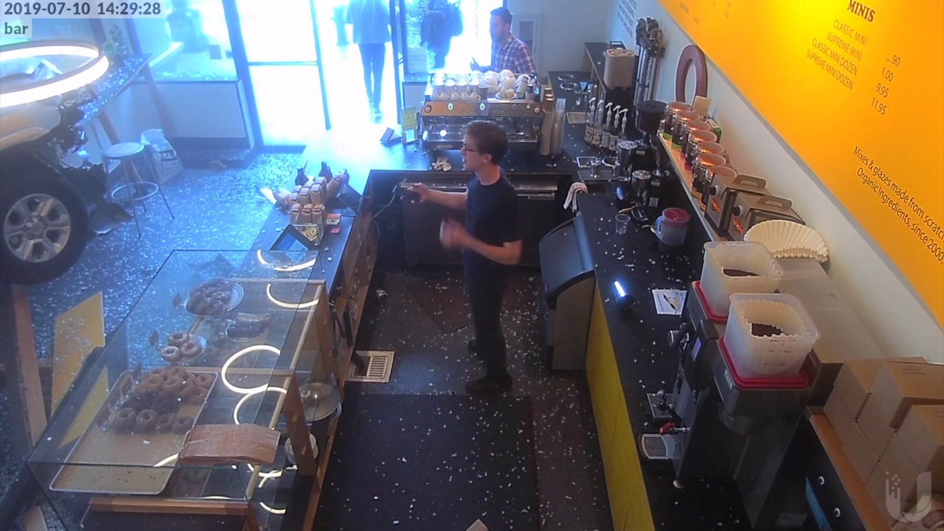 Dramatic surveillance video shows the vehicle slamming into the business as shattered glass hits people who were standing by the window.
