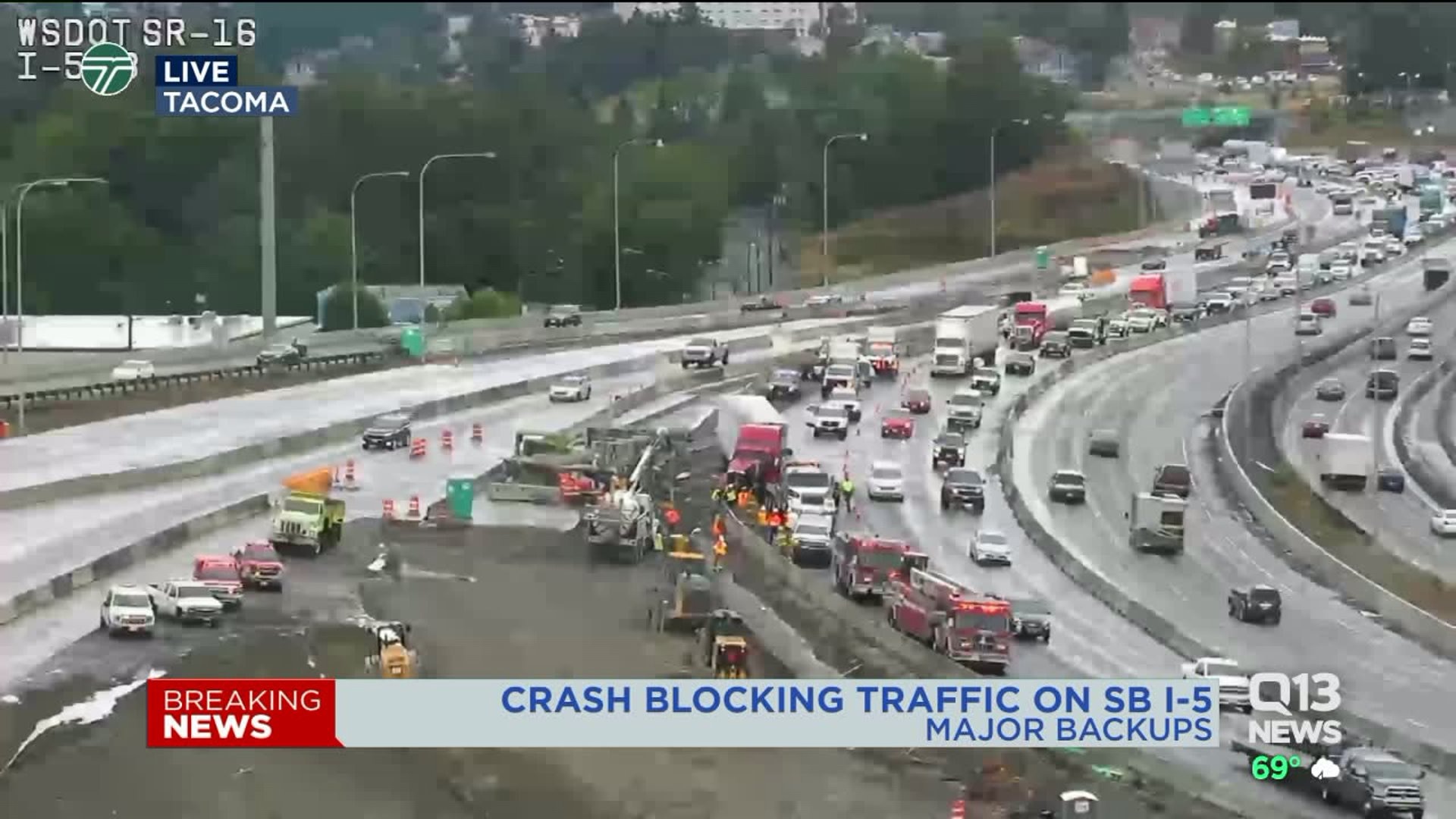 Traffic backed up on southbound I-5 in Tacoma after semi-trailer crashes