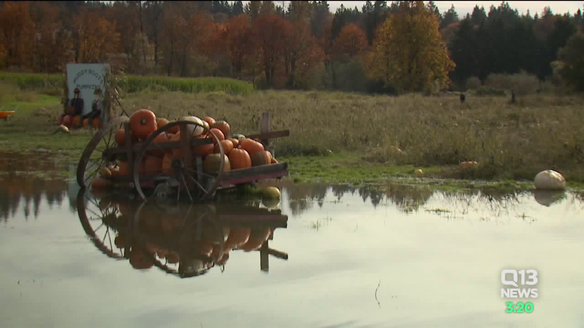 This week's flooding in the Snoqualmie Valley has devastated area farms amid prime harvest season. October is prime harvest season for pumpkins and squash - and this weekend (the weekend before Halloween) is typically the busiest for local pumpkin patches and corn mazes. Farmers at Muddy Boots Pumpkins are scrambling to get the water out in time for visitors. "We are definitely gonna be open," said Kerrie Roetcisoender with Muddy Boots. "I say to come out and support, whether it's us at Muddy Boots or if it's any farmer in the valley, or just your local pumpkin patches. Those are local people that are working really hard, and instead of just looking at pretty pumpkins come out and support them that way." The valley was hit with high water after heavy rains overflowed the banks of the Snoqualmie and Tolt rivers. The Cascade foothills got 4-6 inches of rain in one night, which caused the Snoqualmie River to reach one of its top 10 flows in recorded history. The floodwaters have since receded, leaving a big muddy mess at area farms. Owners of Muddy Boots say they'll be open, so get out your muddy boots and take the kids to the corn maze!