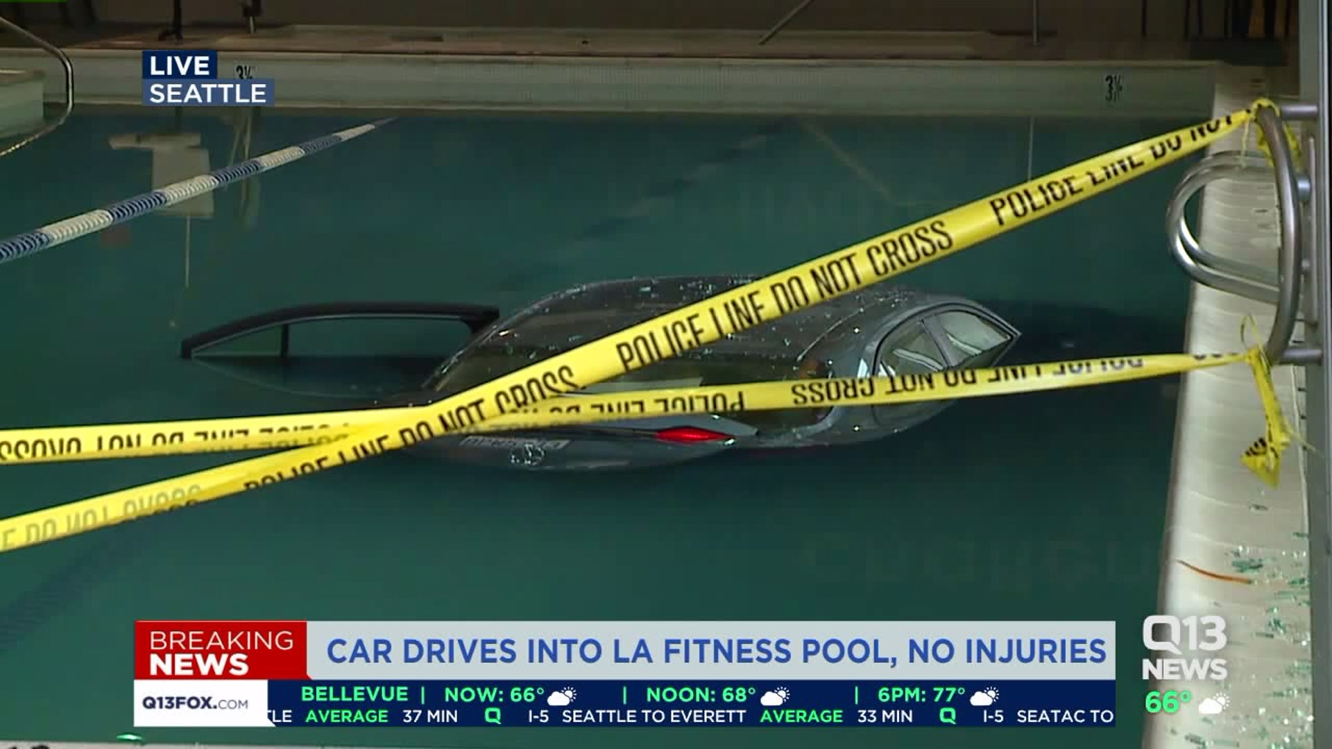 A car crashed into an LA Fitness in Seattle's Bitter Lake neighborhood Monday morning, sending it straight into the swimming pool where three people were swimming.