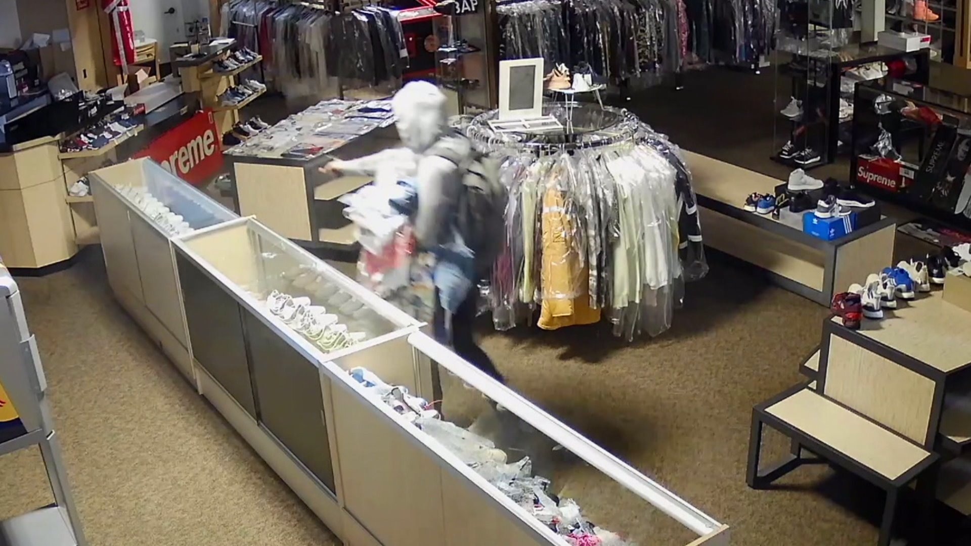 Surveillance video released by police shows the suspect walking store to store, shooting out windows and bagging expensive clothes and shoes.