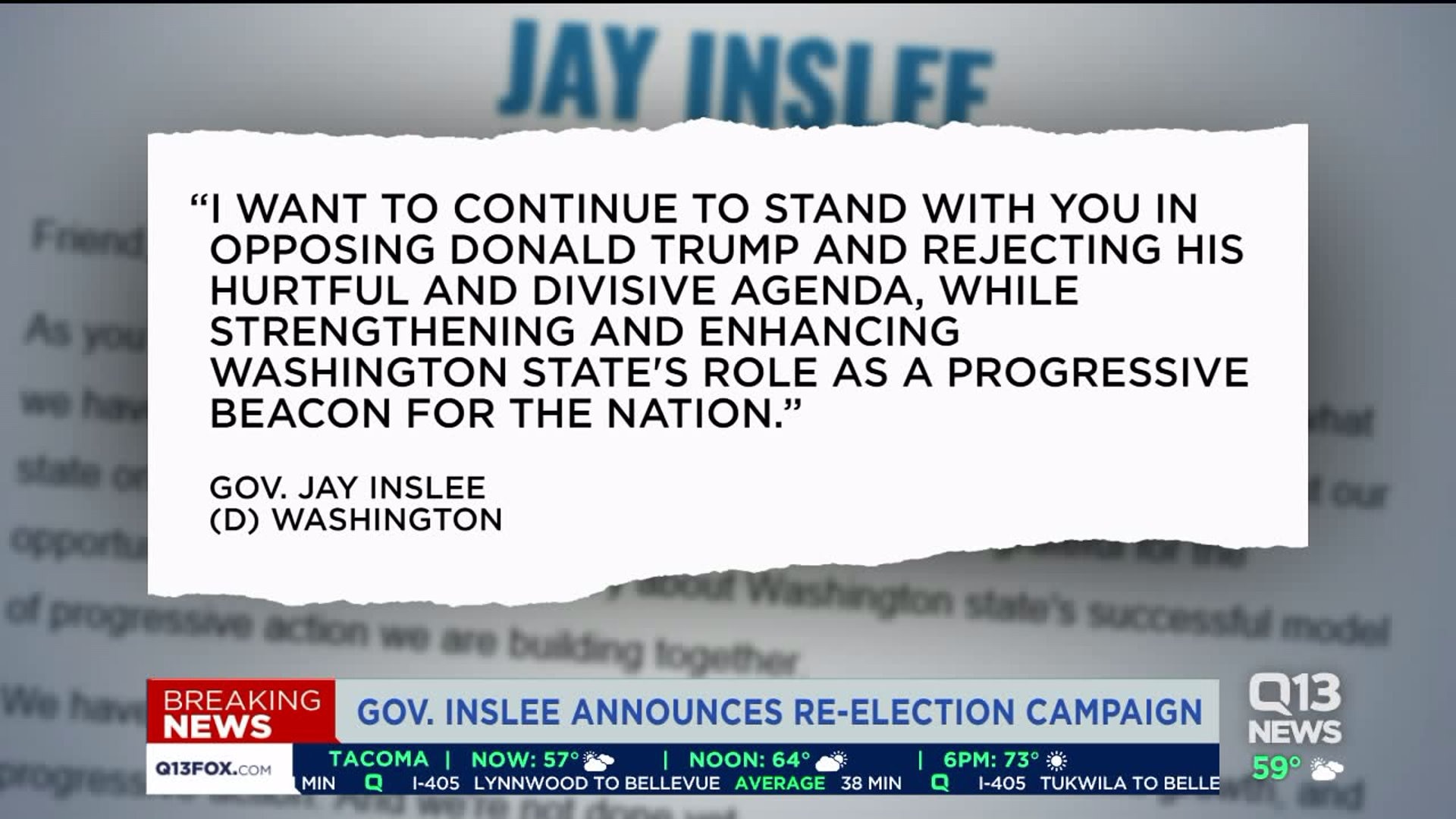 Washington Gov. Jay Inslee announced his bid for a third term as governor in an email to supporters, saying that while it was an honor to run for president, he wants to continue his work leading the state.