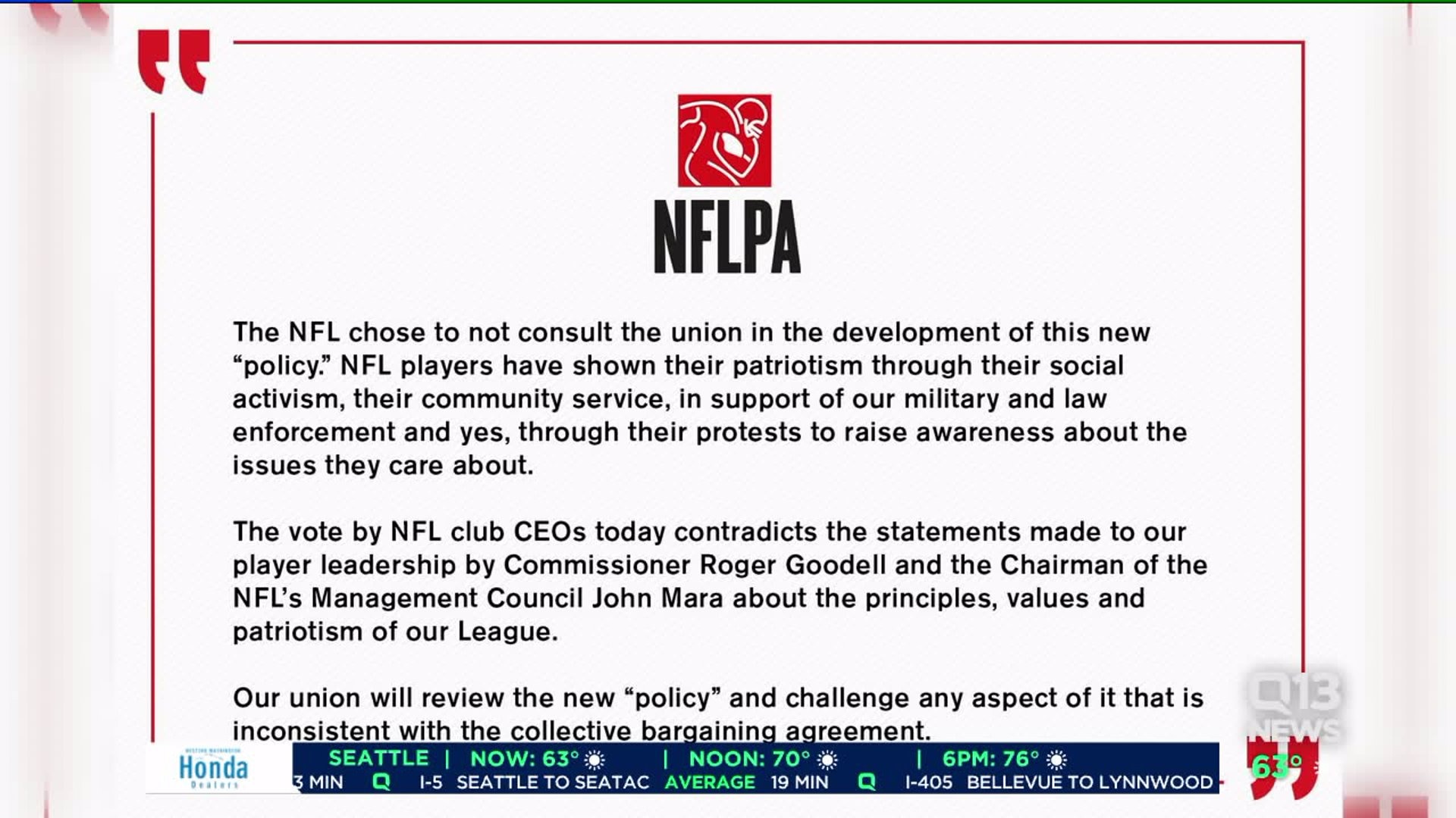 NFL says players on field must stand for the National Anthem