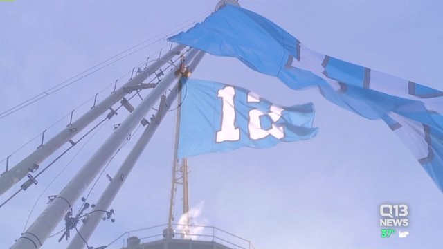 12`s flag raised ovefr Space Needle