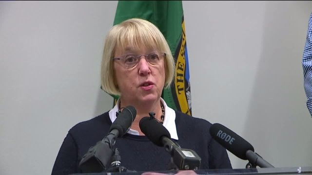 Sen. Patty Murray talks at reporters at Sea-Tac Airport regarding the President`s immigration ban.