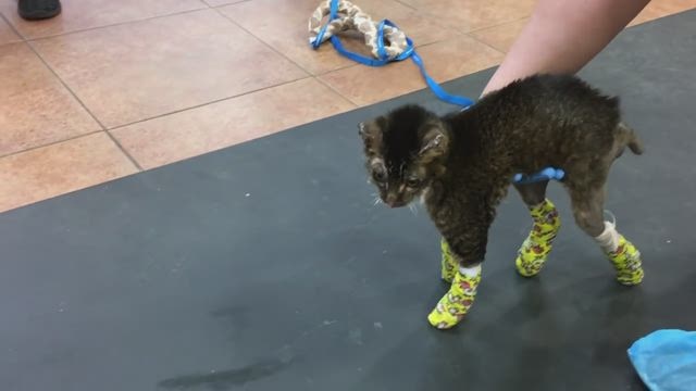 Burned kitty learns to walk