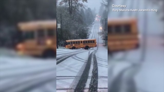 School bus slides down hill on icy road