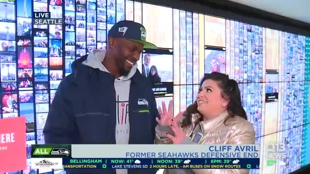 Former Seahawk Cliff Avril raises 12 flag atop Space Needle