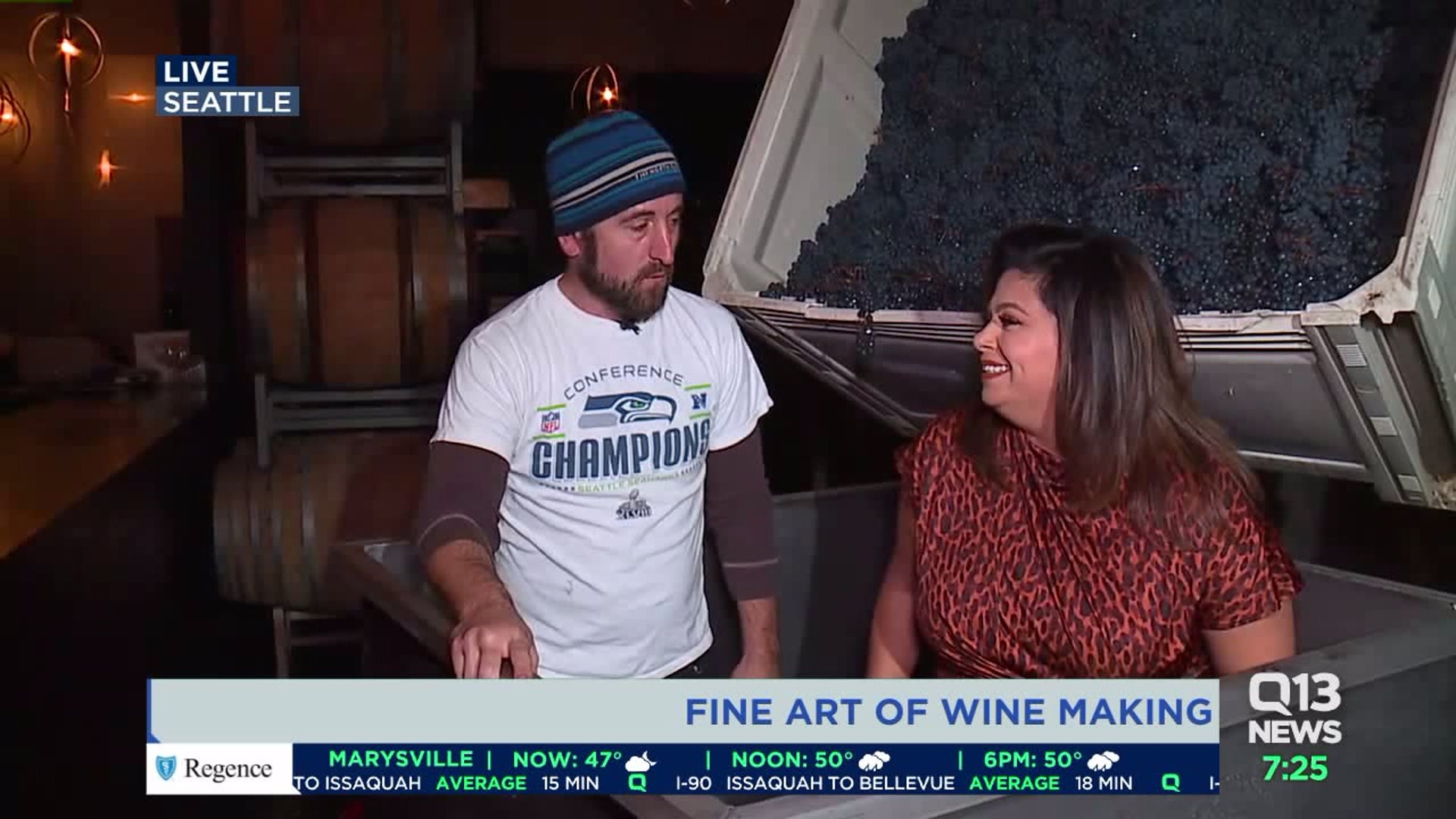 Ellen Tailor is with Ryan Crane a winemaker at Kerloo Cellars, crushing grapes at SODO Wineworks