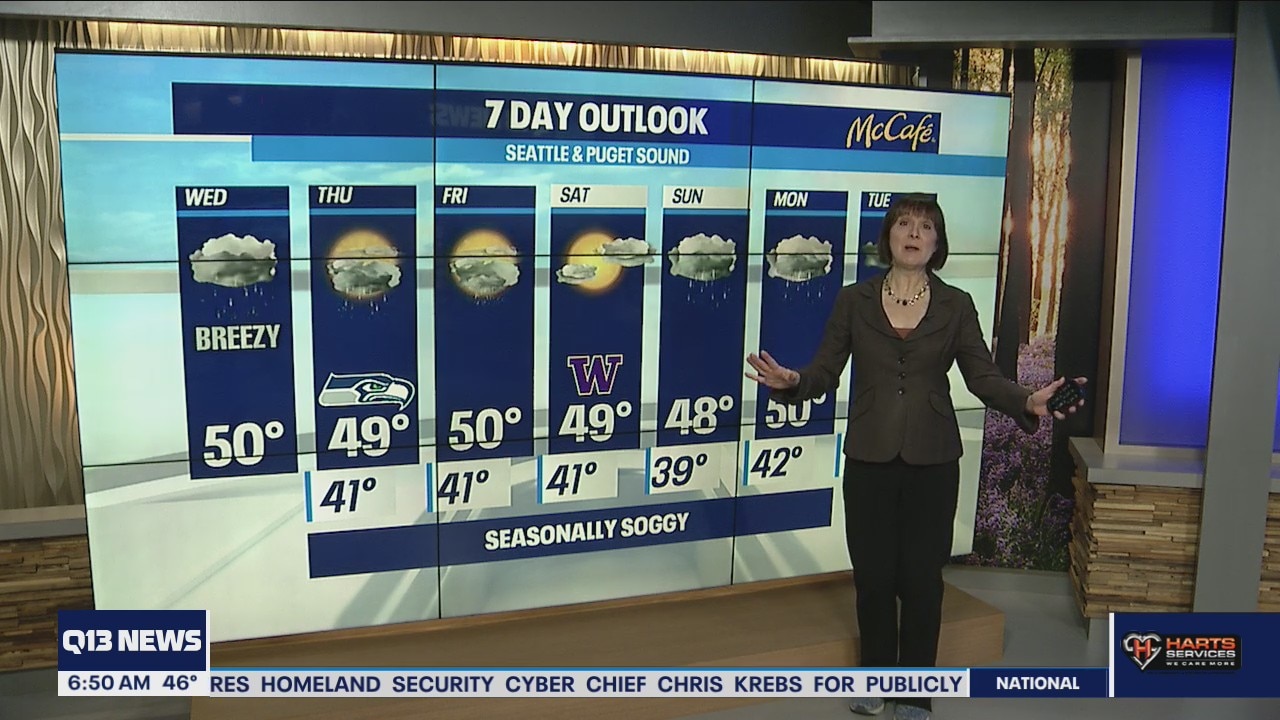 Wet and breezy with highs around 50 for most of Western Washington.