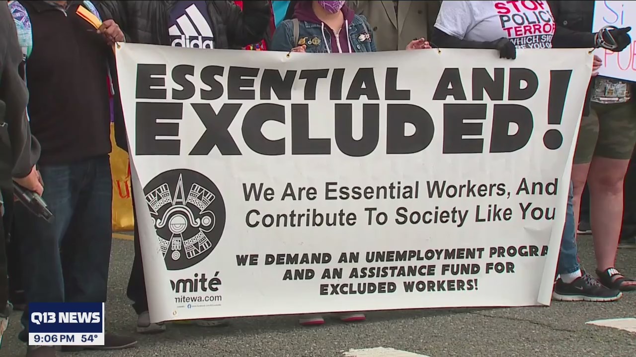 Demonstrators march in solidarity for immigrant workers in Seattle on May Day
