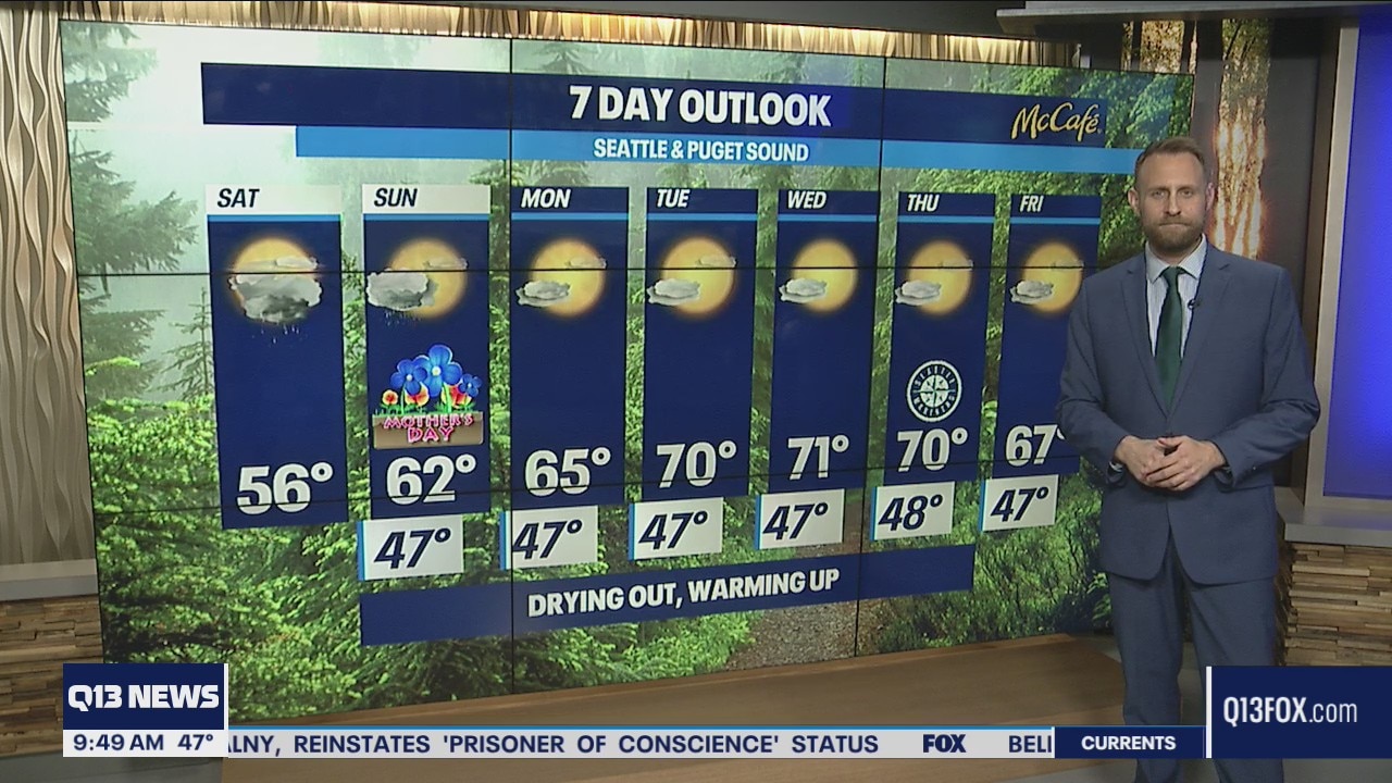 Mid-50s for Saturday with scattered rain showers, temps slightly warming up for Mother's Day and heading into the work week. Q13 News' Tim Joyce has the 7 day forecast.