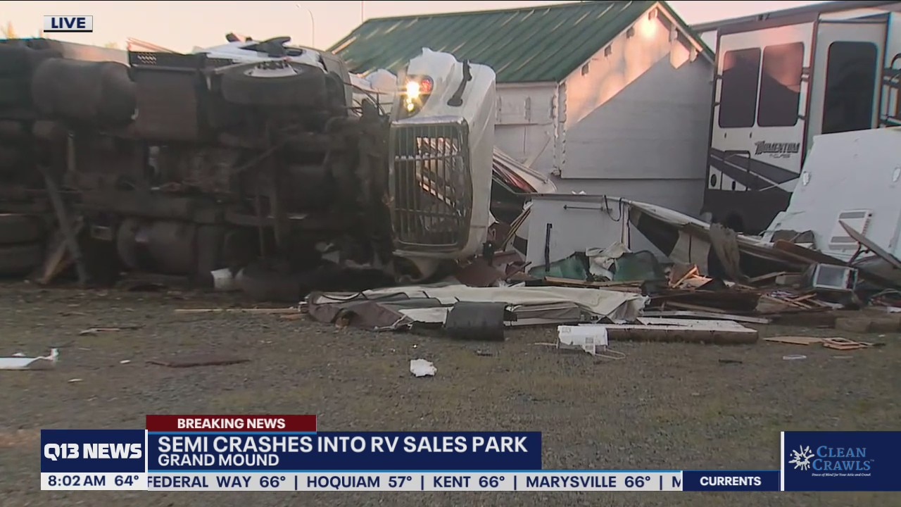 Semi crashes into RV sales park