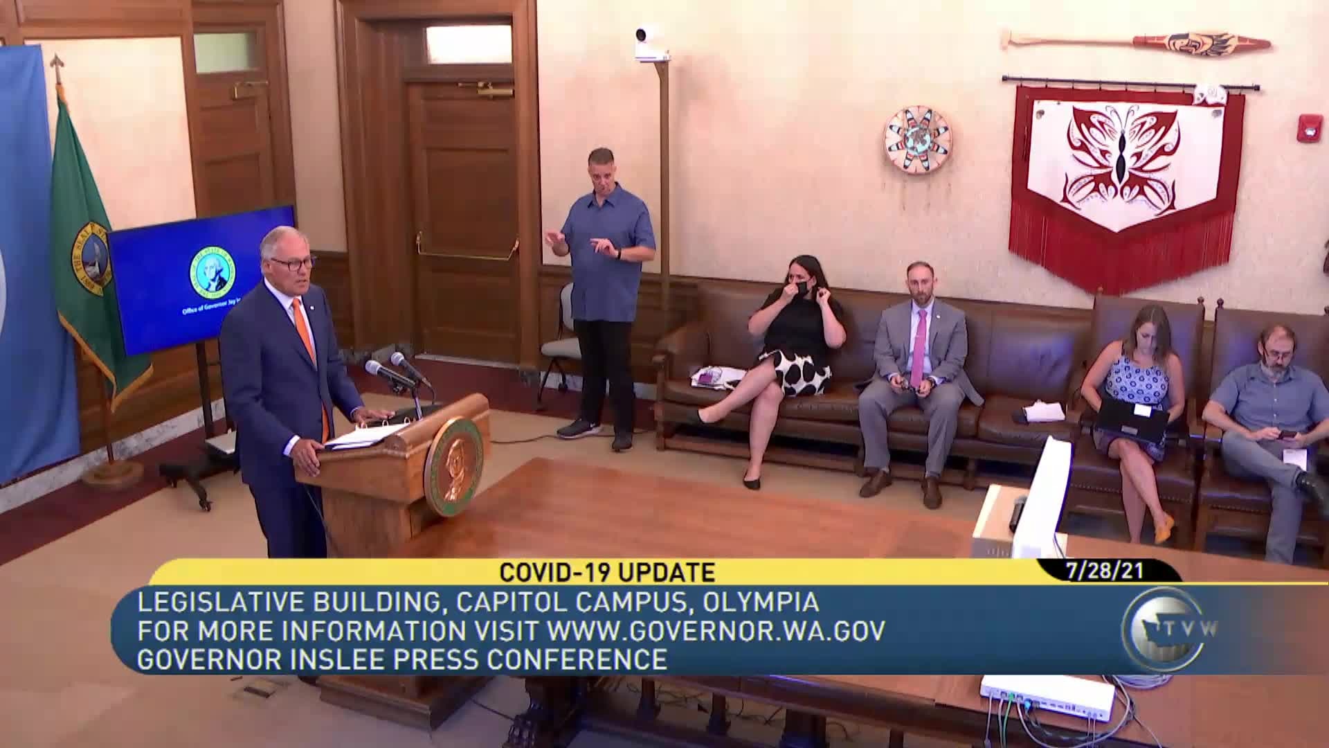 Washington state will follow federal guidance and recommend that those who are are vaccinated wear a mask in public indoor settings in areas where there is “substantial or high” rates of COVID-19, Gov. Jay Inslee said Wednesday. Video: TVW