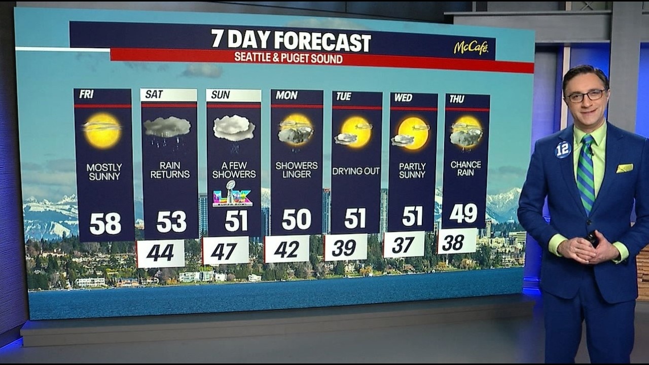 Spring-like weather comes to an end on Friday as rain makes its way into the Puget Sound area for Super Bowl weekend.