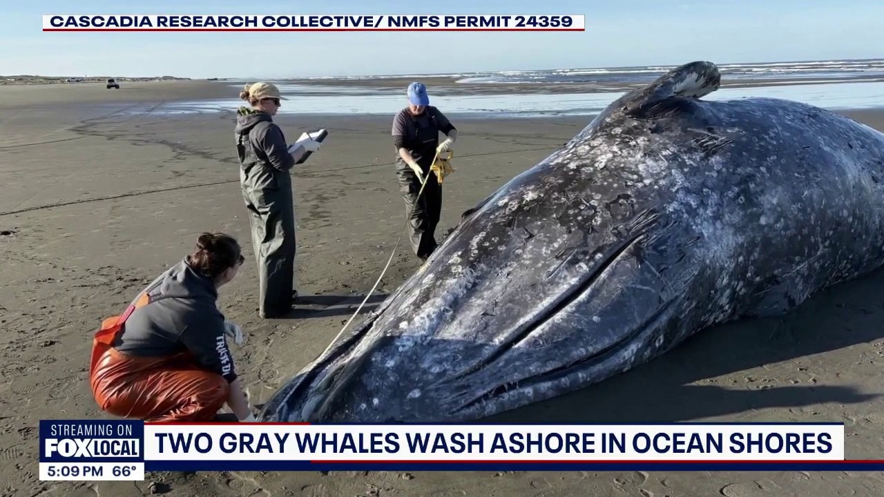 Researchers are investigating two gray whales that washed ashore in Ocean Shores. Officials say both animals were malnourished, and one showed signs of possible trauma consistent with a boat strike.