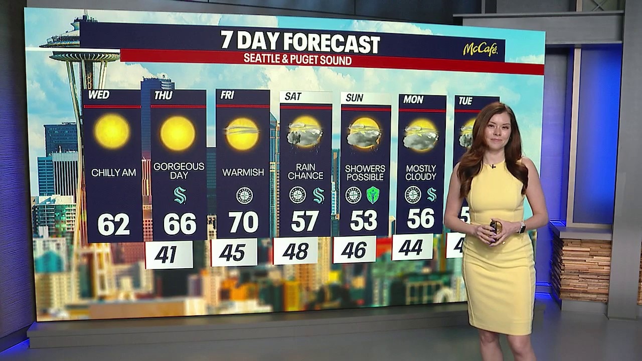 Seattle weather: Cool start, afternoon sunshine for WednesdaySkies will remain sunny and dry through Friday, but shower chances return for the weekend. Highs will be on the cooler side into next week, which could bring snow levels back down to the passes for a few flakes.
